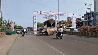रस्त्याच्या मधोमध जाहिरातींची कमान, अपघातांना निमंत्रण संगमनेर मधील नागरिकांमध्ये तीव्र संताप, सरकारी पैशाची उधळपट्टी