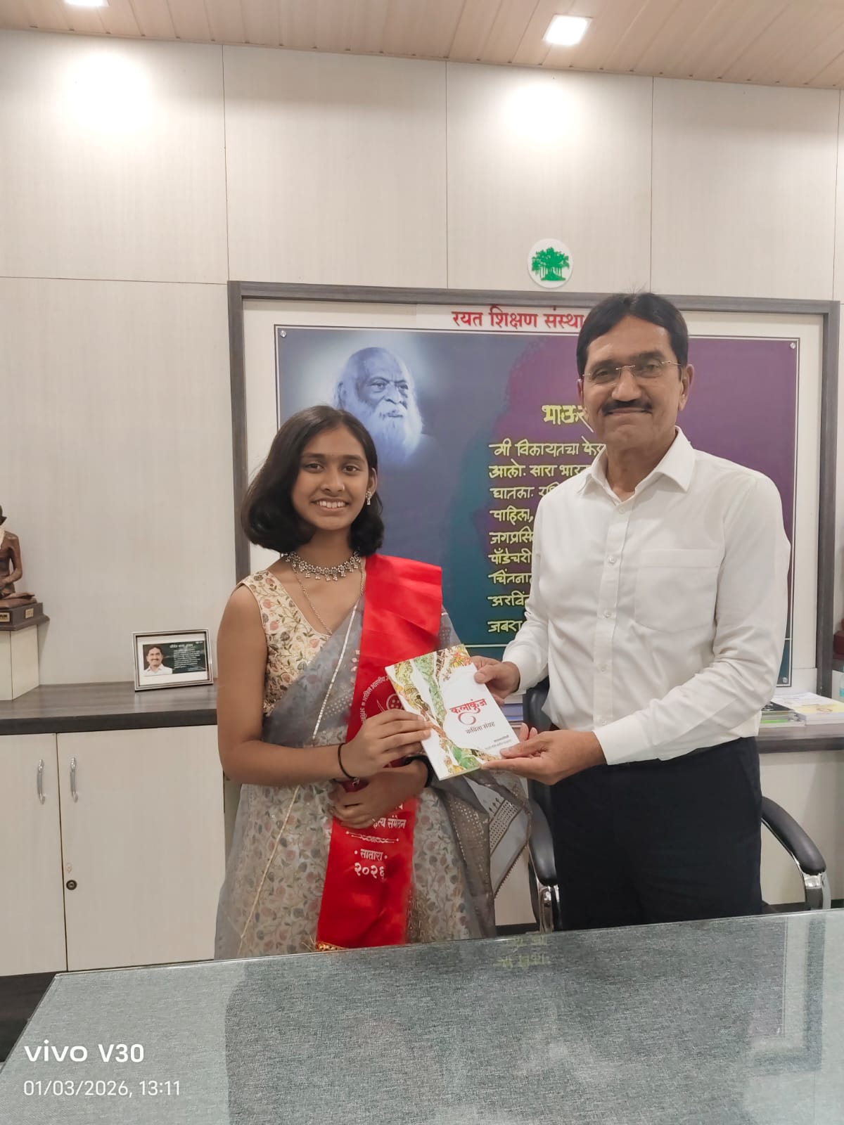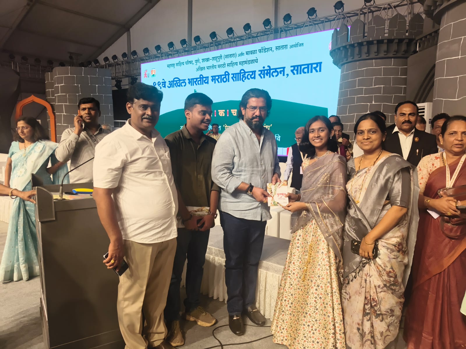 कोपरगाव विजय कापसे दि ४ जानेवारी २०२५– सातारा येथे भरलेल्या ९९ व्या अखिल भारतीय मराठी साहित्य संमेलनात कोपरगाव येथील कर्मवीर शंकरराव काळे माध्यमिक विद्यालय करंजी येथील कलाशिक्षक संदीप चव्हाण यांची कन्या बाल कवयित्री रेवती संदीप चव्हाण हिच्या ‘कलाकुंज’ या कवितासंग्रहाचे प्रकाशन भोसले राज्याचे सार्वजनिक बांधकाम मंत्री शिवेंद्रसिंह राजे यांच्या शुभहस्ते तर मदत व पुनर्वसन मंत्री मकरंद पाटील रयत शिक्षण संस्थेचे चेअरमन चंद्रकांत दळवी, सचिव विकास देशमुख, ज्येष्ठ साहित्यिक लक्ष्मण गायकवाड आदी मान्यवरांची प्रमुख उपस्थितीत झाले.