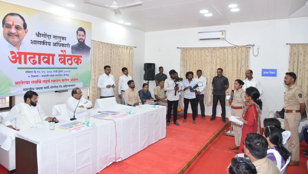 श्रीगोंदा तालुक्यात राबविण्यात येणाऱ्या विविध शासकीय योजनांचा सखोल आढावा जलसंपदा मंत्री तथा जिल्ह्याचे पालकमंत्री मा. डॉ. राधाकृष्ण विखे पाटील यांनी आज माऊली संपर्क कार्यालय, श्रीगोंदा येथे घेतला. त्याप्रसंगी उपस्थित अधिकाऱ्यांनी संवाद साधताना ते बोलत होते.
