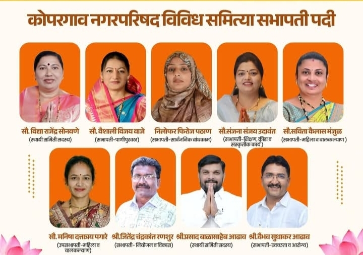 या नवनियुक्त पदाधिकाऱ्यांचा संजीवनी उद्योग समूहाचे अध्यक्ष बिपीनदादा कोल्हे, मा. आ. स्नेहलताताई कोल्हे, युवानेते विवेकभैय्या कोल्हे,नगराध्यक्ष पराग संधान यांच्यासह सर्व मान्यवर, नगरसेवक व नागरिकांनी अभिनंदन केले आहे. महिलांच्या हाती जबाबदारी दिल्याने शहराच्या विकासकामांना संवेदनशीलता, पारदर्शकता आणि वेग येईल, असा विश्वास यावेळी व्यक्त करण्यात आला.कोपरगावच्या विकासाचा हा नवा अध्याय असून, सर्व समित्यांच्या माध्यमातून नागरिकाभिमुख, समतोल आणि सर्वसमावेशक विकास साधला जाईल, अशी अपेक्षा व्यक्त होत आहे.