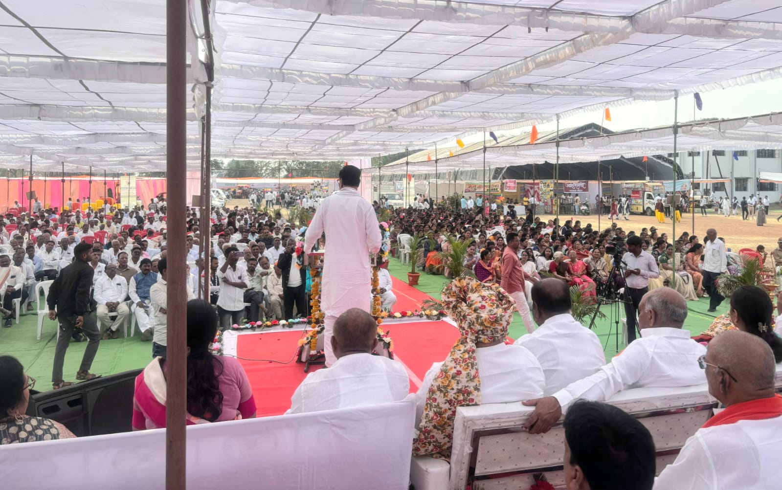 यावेळी बोलताना मा. कृषिमंत्री बाळासाहेब थोरात म्हणाले की कृष्णराव इंगळे यांच्या अमृत महोत्सवानिमित्त होत असलेल्या कृषी प्रदर्शनातून शेतकऱ्यांना नक्कीच नवीन तंत्रज्ञानाची माहिती मिळणार आहे. दहा एकर परिसरामध्ये उभारलेल्या या कृषी प्रदर्शनातून प्रात्यक्षिके, शेती, योग्य फळे, भाजीपाला ,वनौषधी ,फुल शेती, व्यावसायिक व उपयुक्त साधनांची दालने यामुळे शेतकऱ्यांना या क्षेत्रातील बदलांची माहिती मिळणार आहे. भारत हा कृषिप्रधान देश असून शेतकरी आणि शेती या विषयावर अर्थव्यवस्था अवलंबून आहे म्हणून सरकारने शेतकऱ्यांच्या पाठीशी उभे राहिले पाहिजे. राज्यातील सर्व शेतकऱ्यांची संपूर्ण कर्जमाफी करावी अशी मागणी केली. याचबरोबर राज्यामधील महायुती सरकारमध्ये सध्या गोंधळाची स्थिती असून भाजपच्या खेळीमुळे राज्याच्या राजकारणाचे मोठे नुकसान होत असल्याची टीका त्यांनी केली यामुळे गटतट वाढले असून असे राजकारण राज्यासाठी दुर्दैवी असल्याचे ते म्हणाले