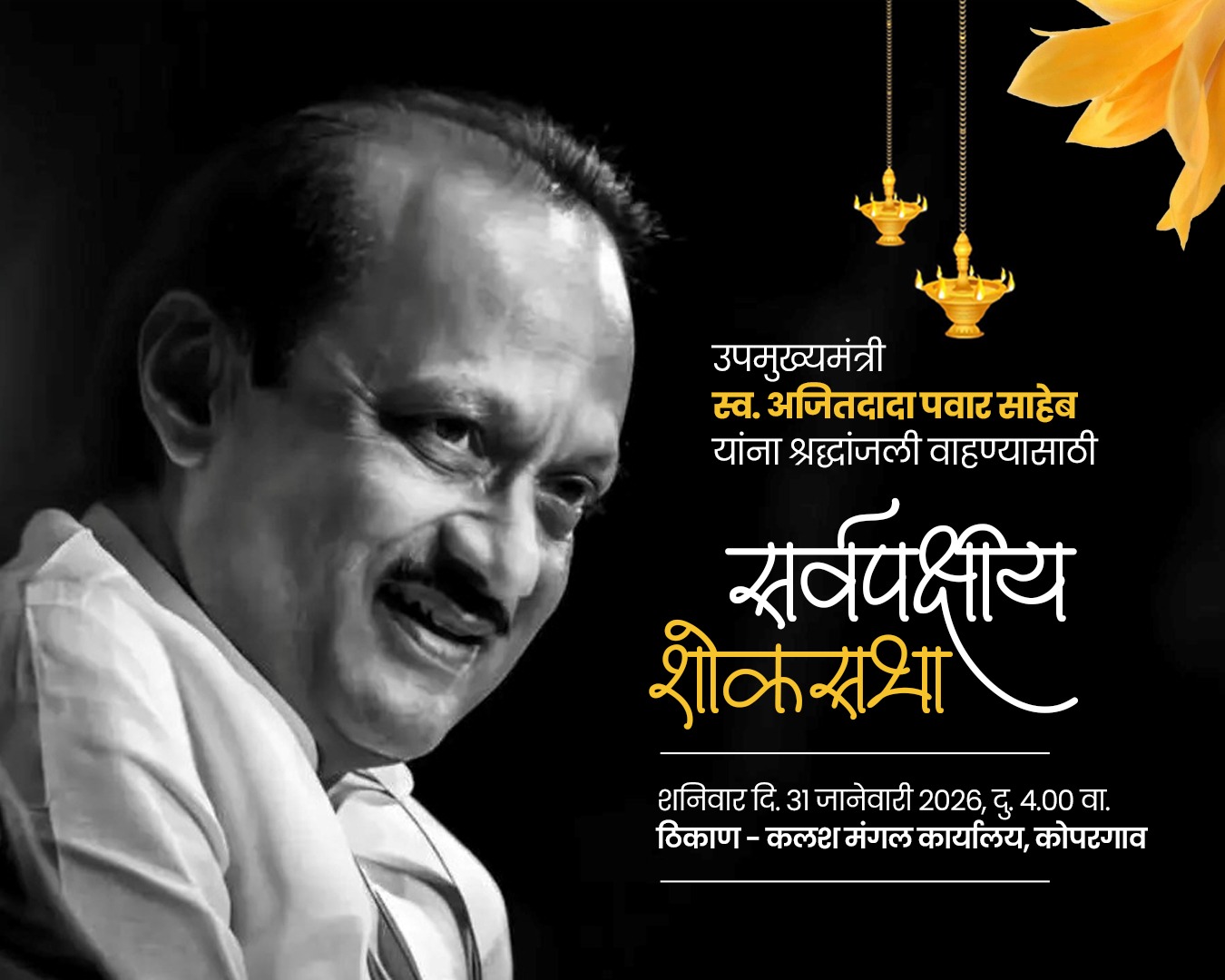 कोपरगाव विजय कापसे दि ३० जानेवारी २०२६– स्व. उपमुख्यमंत्री अजितदादा पवार यांच्या निधनाने संपूर्ण राज्यात शोककळा पसरली आहे. शनिवार (दि.३१) रोजी दुपारी ०४ वा. त्यांना श्रद्धांजली अर्पण करण्यासाठी कलश मंगल कार्यालय कोपरगाव येथे सर्वपक्षीय शोकसभेचे आयोजन करण्यात आले असल्याची माहिती राष्ट्रवादी कॉंग्रेस पक्षाचे आमदार आशुतोष काळे यांच्या जनसंपर्क कार्यालयाकडून देण्यात आली आहे.