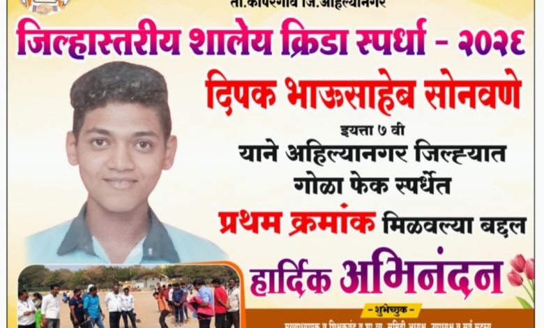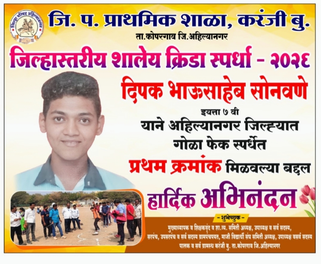 कोपरगाव विजय कापसे दि ५ फेब्रुवारी २०२६– जिल्हा परिषद अहिल्यानगर यांच्या वतीने त्रिमूर्ती शिक्षण संस्था, नेवासा फाटा येथे ५ फेब्रुवारी २०२६ रोजी आयोजित जिल्हा परिषद प्राथमिक शाळांच्या जिल्हास्तरीय शालेय वैयक्तिक क्रीडा स्पर्धेत तालुक्यातील जिल्हा परिषद प्राथमिक शाळा, करंजी बुद्रुक या शाळेचा इयत्ता ७ वीचा विद्यार्थी दिपक भाऊसाहेब सोनवणे याने गोळाफेक स्पर्धेत चमकदार कामगिरी करत अहिल्यानगर जिल्ह्यात प्रथम क्रमांक पटकावत गावसह तालुक्याच्या शिरपेचात मानाचा तुरा रोवला आहे.
