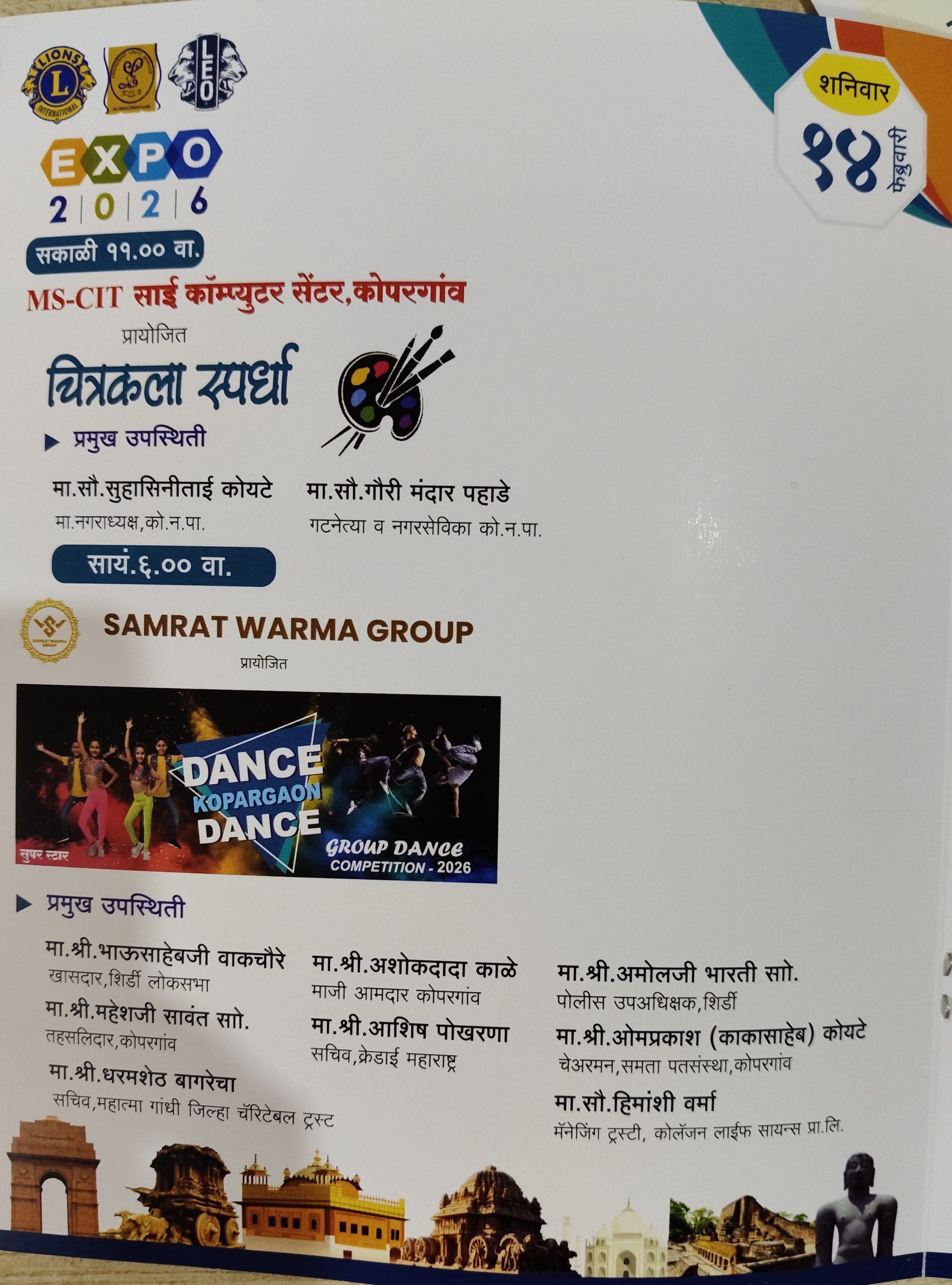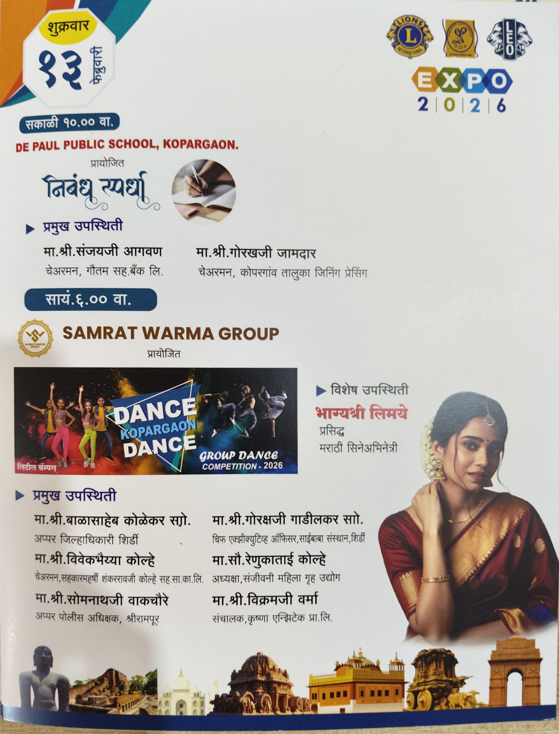 सांस्कृतिक महोत्सवा अंतर्गत भारतातील विविध राज्यांची वेशभूषा व परंपरा दर्शविणारी लोकनृत्य रॅली व सादरीकरण १२ फेब्रुवारी ला होणार आहे. तर १३ फेब्रुवारी रोजी सम्राट वर्मा ग्रुप प्रस्तुत डान्स कोपरगाव डान्स लहान गट या डान्स स्पर्धा प्रसिद्ध मराठी सिनेअभिनेत्री भाग्यश्री लिमये यांची विशेष उपस्थिती असणार आहे. तर १४ फेब्रुवारी रोजी सम्राट वर्मा ग्रुप प्रस्तुत डान्स कोपरगाव डान्स मोठा गट असे आयोजन केले आहे. दि. १५ फेब्रुवारी रोजी कोपरगावतील नाट्य रसिकांना मंच उपलब्ध करुन देण्यासाठी तुलसीदास आर खुबानी ज्वेलर्स प्रस्तुत कॉमेडी नाटक स्पर्धेचे आयोजन केले आहे. या कार्यक्रमासाठी प्रसिद्ध रिल स्टार ऋषी हराळ व टिम यांची उपस्थिती असणार आहे. तसेच पारितोषिक वितरणासाठी प्रसिद्ध मराठी सिनेअभिनेत्री स्पृहा जोशी यांची विशेष उपस्थिती असणार आहे. शालेय विद्यार्थ्यांसाठी दुपारी चित्रकला स्पर्धा, निबंध स्पर्धा, सुंदर हस्ताक्षर स्पर्धा घेण्यात येणार आहेत. अशी माहिती राम थोरे यांनी दिली.