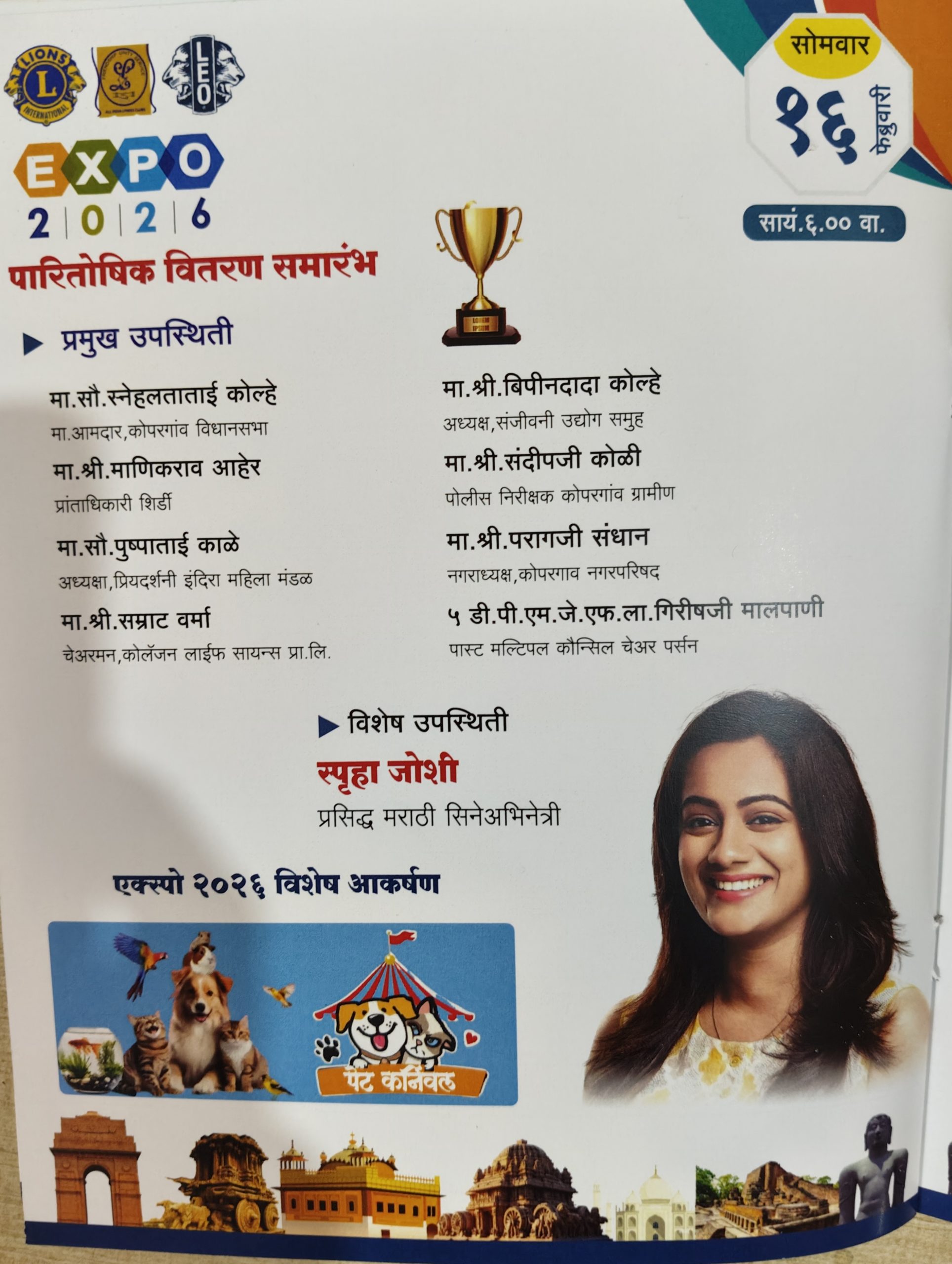 या वर्षीचे मुख्य आकर्षण म्हणजे पेट कर्णिवल या मध्ये विविध प्रकारचे मत्स, पक्षी व पाळीव प्राणी यांचे प्रदर्शन असणार आहे. अशी माहिती सुमित भट्टड यांनी दिली. लायन्स क्लब हे सामाजिक बांधिलकी जपणारे क्लब असल्या मुळे कोपरगावकरांसाठी मोफत डोळे तपासणी आणि रक्तदान शिबिर व कॅन्सर जनजागृती कार्यक्रमाचे आयोजन करण्यात येणार आहे. अशी माहिती लायन्स क्लब चे अध्यक्ष अक्षय गिरमे यांनी दिली.