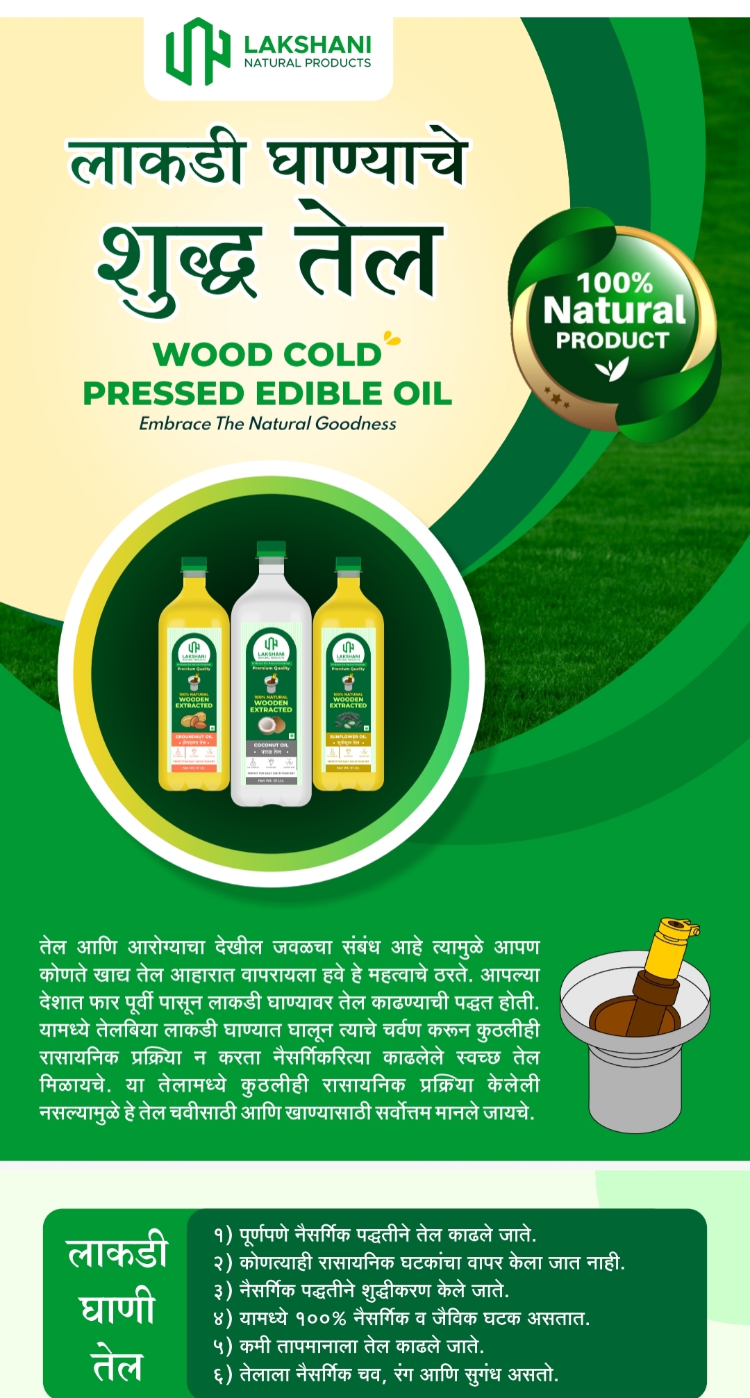 मानवी आरोग्याबाबत दिवसेंदिवस ज्या शारीरिक समस्या उद्भवत आहेत त्याचे मुख्य कारण हे आपल्या दैनंदिन आहारात मोठ्या प्रमाणात वापरले जाणारे रिफाइंड तेल हेच असल्याचे अनेक तज्ञांचे मत आहे परंतु या उलट लाकडी घाण्यापासून तयार केलेले तेल हे आरोग्यास फायदेशीर ठरत असल्याचा अनेक तज्ञांचा अहवाल आहे त्यामुळे सध्या या तेलाला बाजारपेठेत मागणी वाढत असल्याचे कोपरगाव येथे सुरू असलेल्या लायन्स,लिनेस, लियो व क्रेडाई बिजनेस एक्सपो मध्ये लक्षणी नॅचरल प्रॉडक्ट यांनी आपल्या कंपनीमध्ये लाकडी घाण्यापासून निर्मित शेंगदाणा तेल, मोहरी तेल, नारळ तेल,सूर्यफूल तेल, करडई तेल, तीळ तेल, जवस तेल, खुरासनी तेल, बदाम तेल व एरंडी तेल आदी मानवीय आरोग्यास उपयुक्त असलेल्या तेलाला मागणी वाढत आहे.