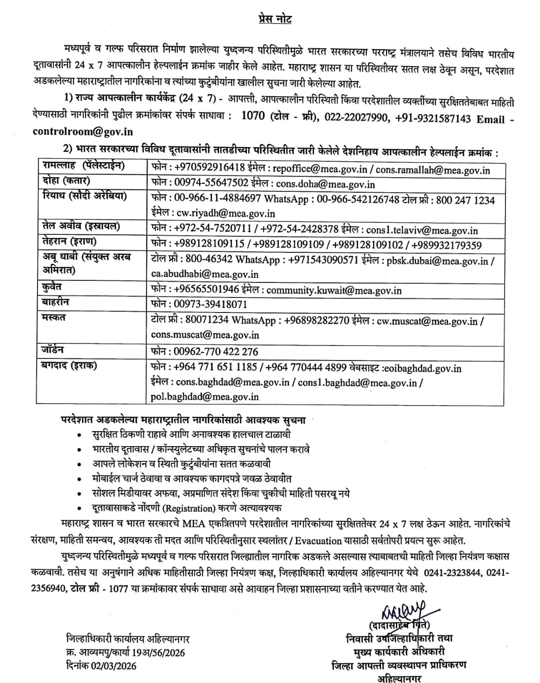 अहिल्यानगर विजय कापसे दि २मार्च २०२६ : – मध्यपूर्व व आखाती परिसरात निर्माण झालेल्या युद्धजन्य परिस्थितीच्या पार्श्वभूमीवर, भारत सरकारचे परराष्ट्र मंत्रालय व महाराष्ट्र शासनाने परदेशात अडकलेल्या भारतीयांच्या सुरक्षिततेसाठी पावले उचलली आहेत. या भागात अडकलेल्या अहिल्यानगर जिल्ह्यातील नागरिकांच्या नातेवाईकांनी मदतीसाठी तत्काळ जिल्हा नियंत्रण कक्षाशी संपर्क साधावा, असे आवाहन निवासी उपजिल्हाधिकारी तथा जिल्हा आपत्ती व्यवस्थापन प्राधिकरणाचे मुख्य कार्यकारी अधिकारी दादासाहेब गिते यांनी केले आहे.