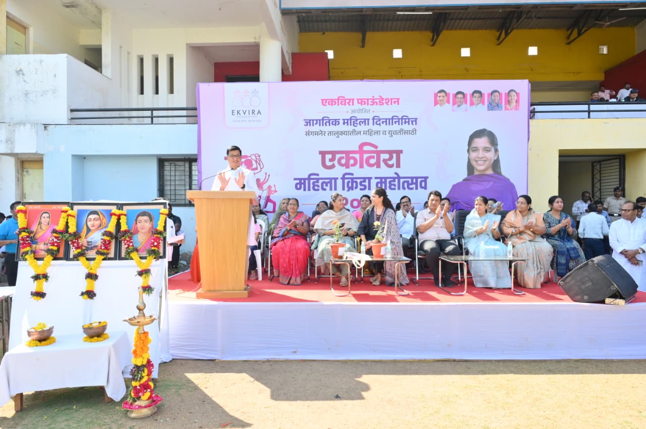 सहकार महर्षी भाऊसाहेब थोरात क्रीडा संकुल येथे एकविरा फाउंडेशनच्या वतीने आयोजित महिला दिनानिमित्त क्रीडा महोत्सव 2026 च्या शुभारंभ प्रसंगी कार्यक्रमात ते बोलत होते. यावेळी अध्यक्षस्थानी मा आ डॉ सुधीर तांबे हे होते तर व्यासपीठावर सौ दुर्गाताई तांबे, नगराध्यक्ष डॉ मैथिलीताई तांबे, एकविराच्या अध्यक्षा डॉ जयश्रीताई थोरात, सुधाकर जोशी, रामहरी कातोरे ,अजय फटांगरे,सौ प्रमिलाताई अभंग, सौ अर्चनाताई बालोडे ,सौ निर्मलाताई गुंजाळ, एकविराच्या शीला पंजाबी, डॉ वृषाली साबळे, शर्मिला हांडे, प्राजक्ता घुले, आदिती खोजे ,तपस्या देशमुख, सुरभी मोरे, वैष्णवी खेडलेकर, तृष्णा आवटी, डॉ सुरभी असोपा, सुनिता कांदळकर, सुविधा आरसिद्ध, यांच्यासह नगरसेविका व विविध महिला पदाधिकारी मोठ्या संख्येने उपस्थित होत्या.