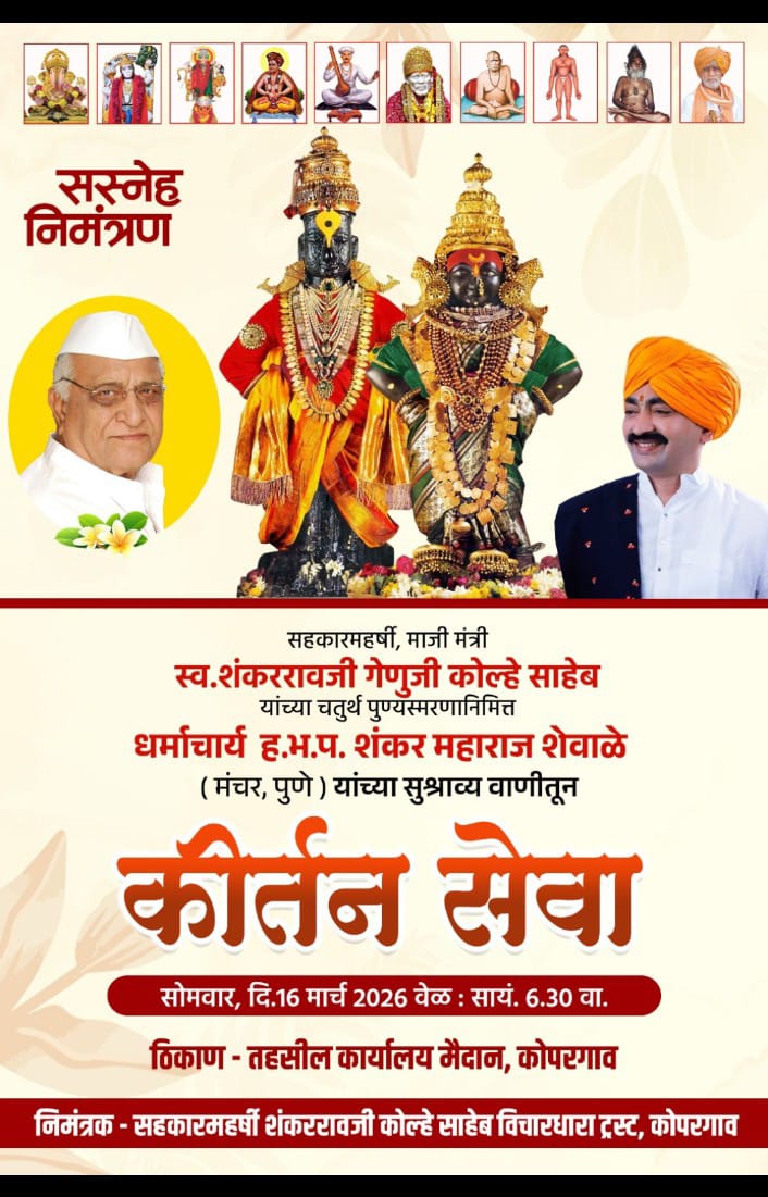 कोपरगाव विजय कापसे दि १४ मार्च २०२६-सहकार क्षेत्रातील ज्येष्ठ नेते आणि महाराष्ट्र राज्याचे माजी मंत्री सहकार महर्षी स्व.शंकररावजी कोल्हे साहेब यांच्या चतुर्थ पुण्यस्मरणानिमित्त कोपरगाव येथे भक्तीमय वातावरणात कीर्तन सेवेचे आयोजन करण्यात आले आहे. हा कार्यक्रम सोमवार दिनांक १६ मार्च २०२६ रोजी सायंकाळी साडेसहा वाजता कोपरगाव येथील तहसील कार्यालय मैदानात संपन्न होणार आहे.