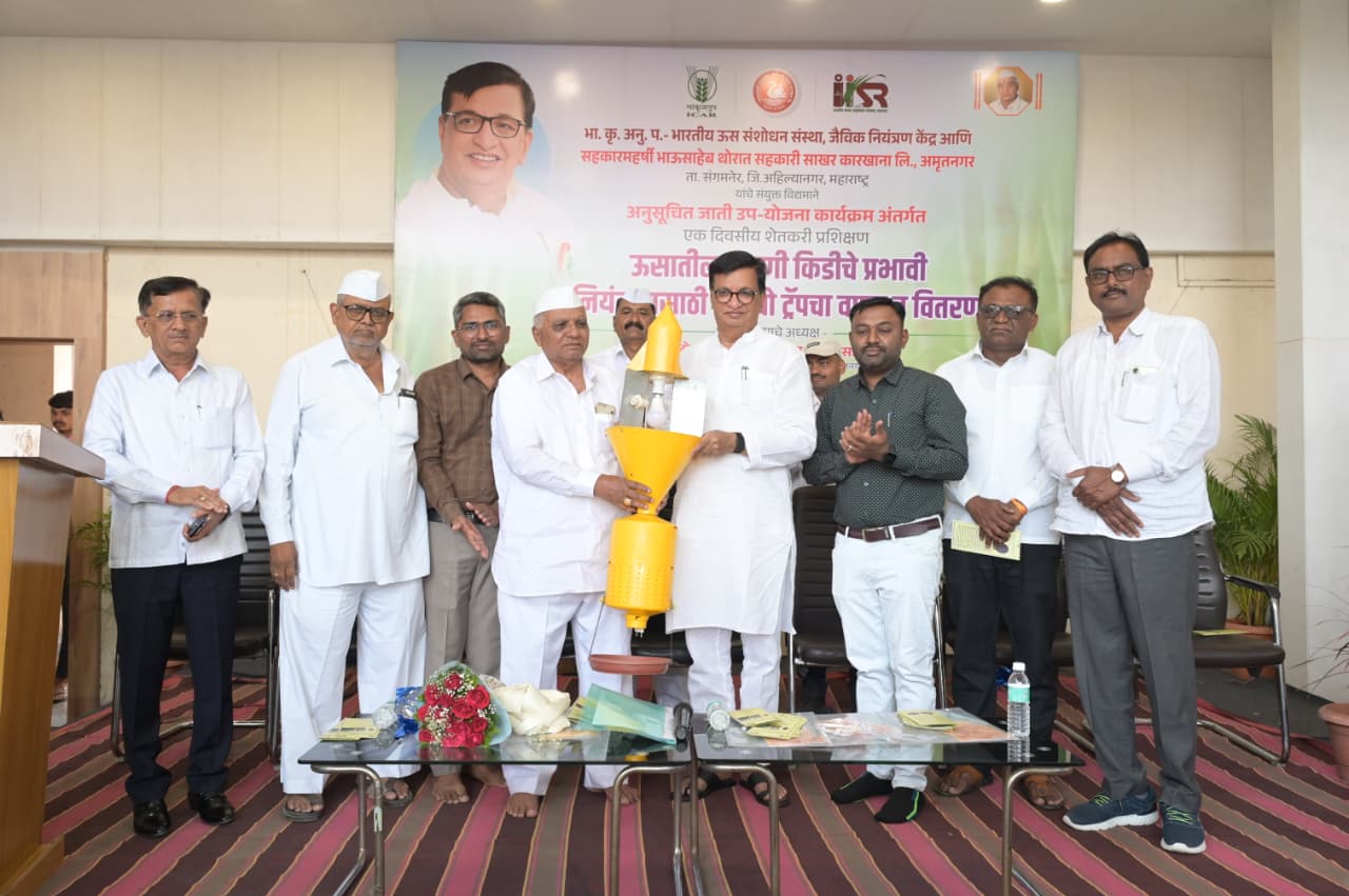 यावेळी बोलताना मा.कृषिमंत्री बाळासाहेब थोरात म्हणाले की, भारताचे पहिले पंतप्रधान पंडित जवाहरलाल नेहरू यांनी भारतीय कृषी संशोधन केंद्राची स्थापना केली आहे. विविध विद्यापीठ मधून होणारे संशोधन या संस्थेमध्ये जातात. त्या माध्यमातून नवनवीन संशोधन शेतकऱ्यांसाठी उपलब्ध होते. ऊस व दूध हे शाश्वत उत्पादन देणारे आहे. थोरात कारखाना व दूध संघाने कायम चांगला भाव दिला आहे. निळवंडेच्या पाण्यामुळे ऊस क्षेत्र वाढणार आहे. शेतकऱ्यांनी उसाचे एकरी उत्पादन वाढवले पाहिजे. याकरता नवीन तंत्रज्ञानाचा वापर करा. या ऊस उत्पादकता वाढीमध्ये हुमणी आळी यासारखे मोठे अडथळे आहेत. विविध फवारणीमुळे मित्र कीड मारली जाते. मात्र हुमणी आळी जमिनीखाली राहते. म्हणून कॉम्बो ट्रॅप मुळे हुमणी आळी यंत्रणात येण्यासाठी मोठी मदत होणार आहे.