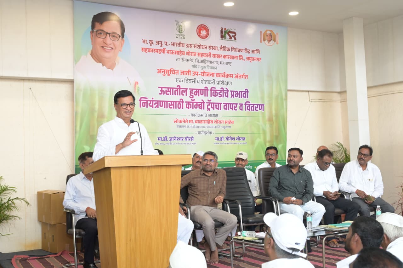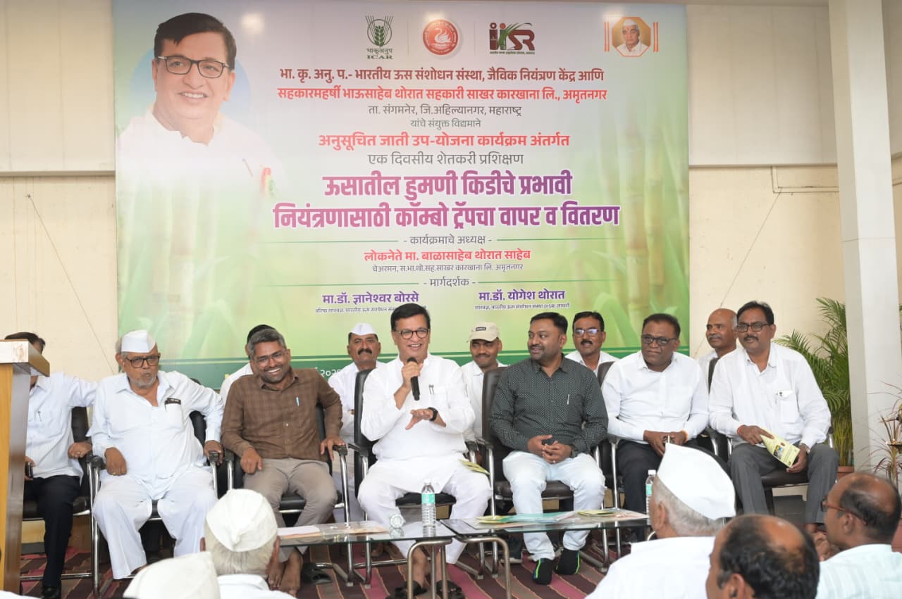 सहकारमहर्षी भाऊसाहेब थोरात सहकारी साखर कारखान्याच्या कार्यस्थळावर भारतीय कृषी संशोधन परिषद व ऊस संशोधन संस्था यांच्या संयुक्त विद्यमाने हुमणी आळी नियंत्रणासाठी कॉम्बो ट्रॅप चा वापर याबाबतचे एकदिवसीय कार्यशाळेत ते बोलत होते. यावेळी व्यासपीठावर लखनऊ येथील भारतीय उत्सव संशोधन संस्थेचे वरिष्ठ शास्त्रज्ञ डॉ.ज्ञानेश्वर बोरसे, शास्त्रज्ञ डॉ. योगेश थोरात, चेअरमन पांडुरंग पा.घुले, संचालक रामनाथ कुटे, विजय राहणे, विनोद हासे, विलास शिंदे, अरुण वाकचौरे, नवनाथ आरगडे, कार्यकारी संचालक जगन्नाथ घुगरकर, भास्कर बागुल, माणिकराव यादव, किरण रोहम, सेक्रेटरी किरण कानवडे, कृष्णा दिघे, कृषी अधिकारी भाऊसाहेब खर्डे, ऊस विकास अधिकारी बाळासाहेब सोनवणे, प्रा.जी.बी.बाचकर यांच्यासह विविध अधिकारी व शेतकरी मोठ्या संख्येने उपस्थित होते.