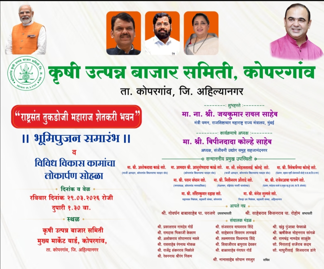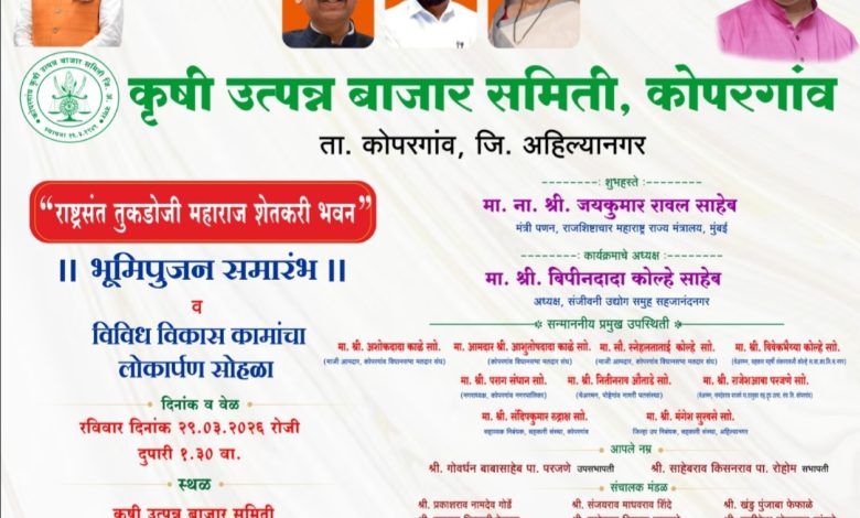 Kopargaon vijay kapse दि २८ मार्च २०२६-कोपरगाव तालुक्यातील कृषी उत्पन्न बाजार समिती येथे राष्ट्रसंत तुकडोजी महाराज शेतकरी भवनाच्या भूमिपूजनाचा शुभारंभ तसेच विविध विकासकामांच्या लोकार्पण सोहळ्याचे आयोजन रविवार (दि.२९ ) मार्च २०२६ रोजी दुपारी ठीक दीड वाजता करण्यात आले आहे. हा सोहळा महाराष्ट्र राज्याचे पणनमंत्री तथा राजशिष्टाचार मंत्री मा. जयकुमार रावल यांच्या प्रमुख उपस्थितीत पार पडणार आहे.या कार्यक्रमासाठी कोपरगाव तालुक्यातील समस्त शेतकऱ्यांनी मोठ्या संख्येने उपस्थित राहावे, असे आवाहन करण्यात आले आहे.