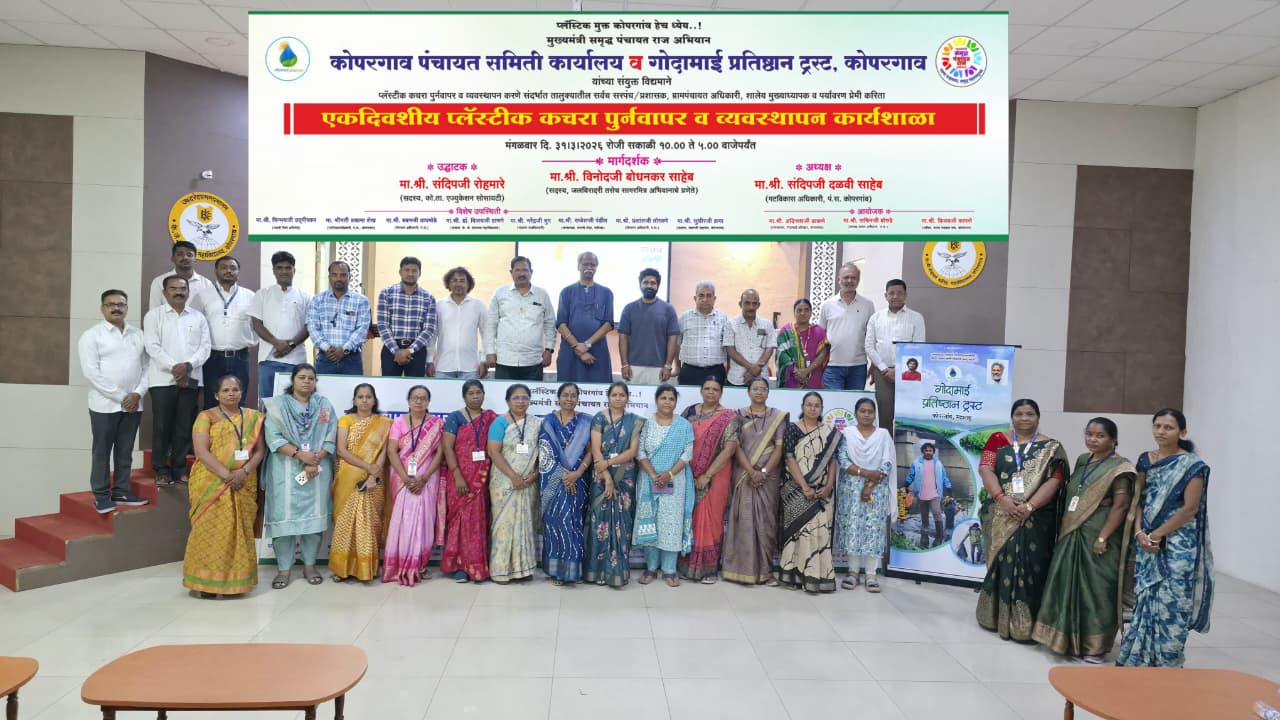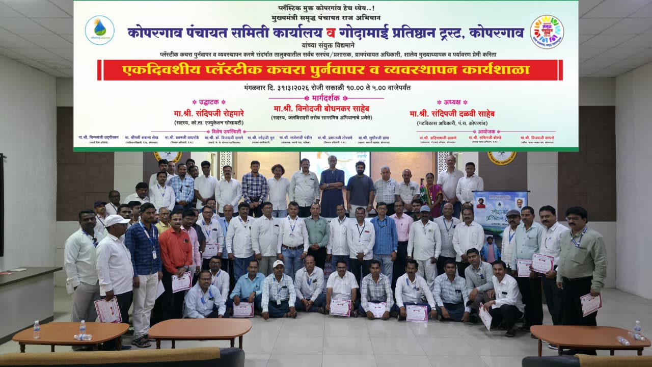कोपरगाव विजय कापसे दि १ एप्रिल २०२६-प्लॅस्टिक मुक्त कोपरगाव हेच ध्येय उराशी बाळगत मुख्यमंत्री समृद्ध पंचायत राज अभियान अंतर्गत कोपरगाव पंचायत समिती कार्यालय व गोदामाई प्रतिष्ठान ट्रस्ट कोपरगाव यांच्या वतीने प्लॅस्टिक कचरा पुनर्वापर व व्यवस्थापन करणे संदर्भात सखोल मार्गदर्शन करण्याच्या उद्देशाने तालुक्यातील सरपंच, प्रशासक, ग्रामपंचायत अधिकारी, शालेय मुख्याध्यापक यांच्याकरिता आयोजित प्लॅस्टिक पुनर्वापर व व्यवस्थापन एक दिवसीय कार्यशाळा मोठ्या उत्साहात संपन्न झाली.