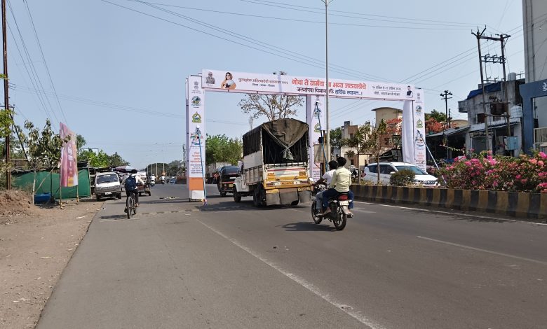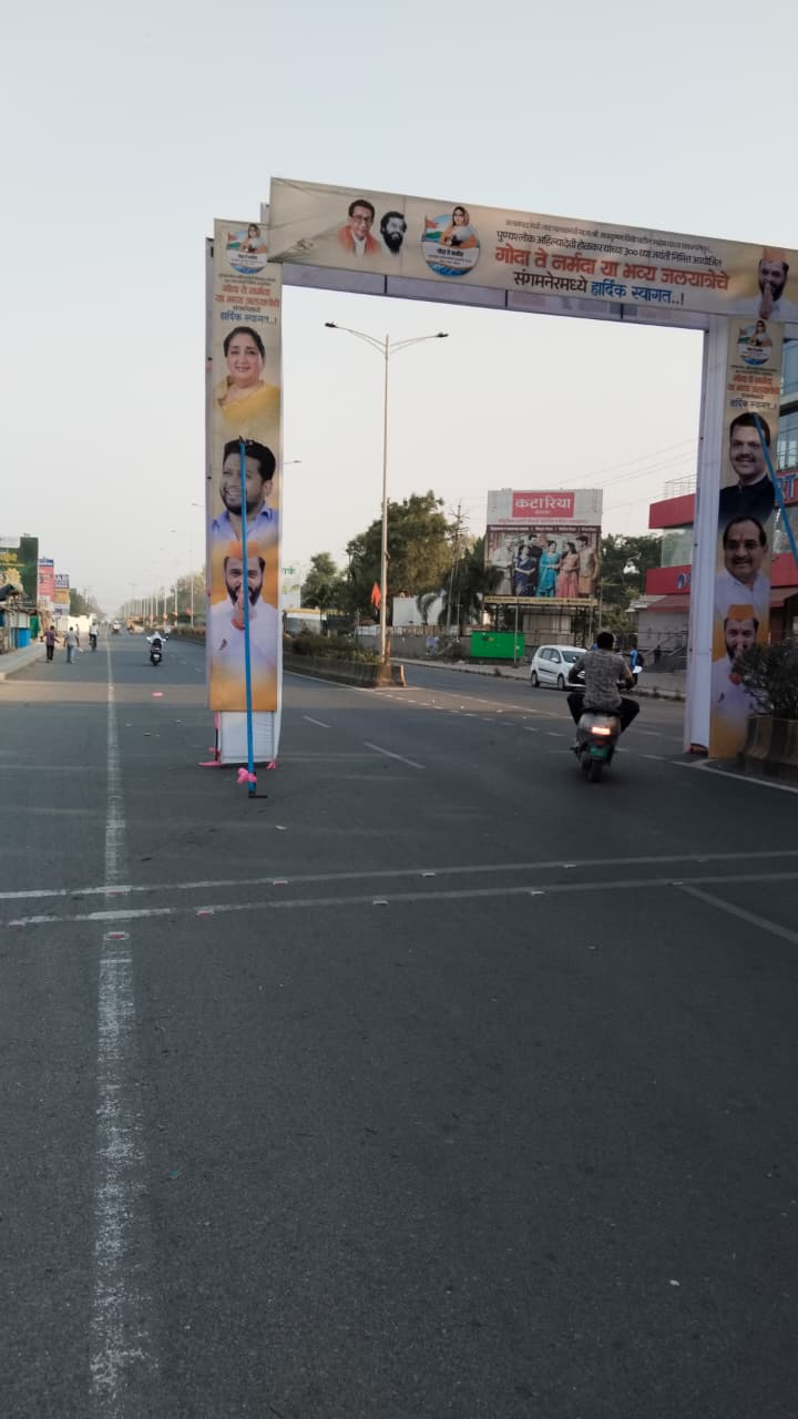 रस्त्याच्या मधोमध जाहिरातींची कमान, अपघातांना निमंत्रण संगमनेर मधील नागरिकांमध्ये तीव्र संताप, सरकारी पैशाची उधळपट्टी