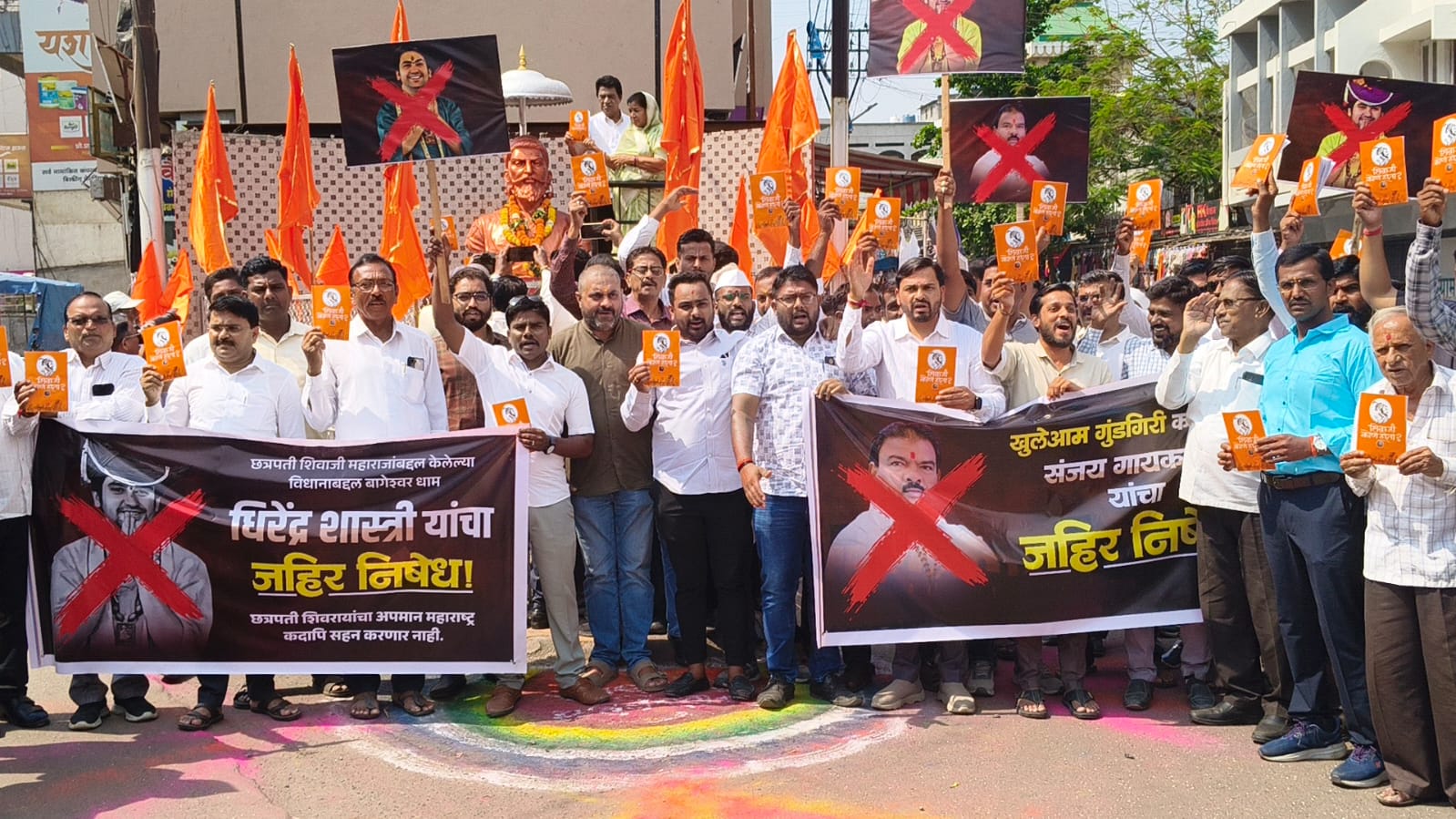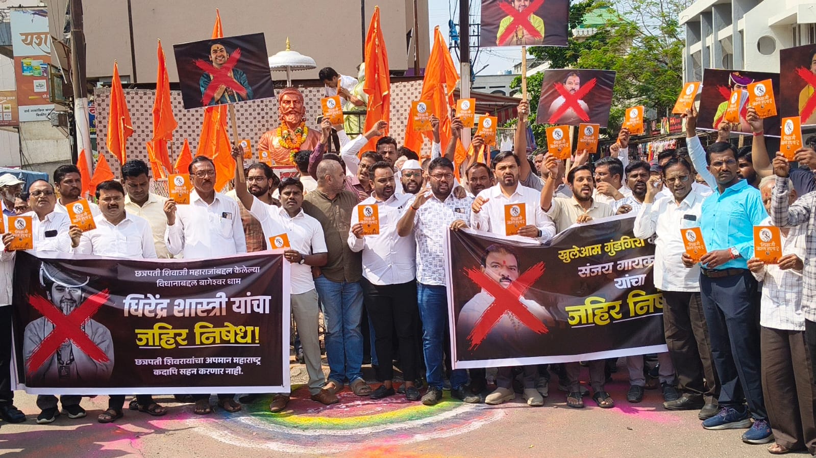छत्रपती शिवाजी महाराजांचा पुतळा येथे त्यांना अभिवादन करण्यात आले.महाराजांचा जयघोष केल्यानंतर तथाकथित महाराज धीरेंद्र शास्त्री व शिंदे सेनेचे आमदार संजय गायकवाड यांच्या बेताल वक्तव्याचा सर्व तरुणांनी जाहीर निषेध केला. दरिंदर शास्त्री व बेताल संजय गायकवाड यांचा जाहीर निषेध असो अशा घोषणा दिल्या.यावेळी जोडे मारो व त्यांच्या पुतळ्याचे दहन करण्यात आले.