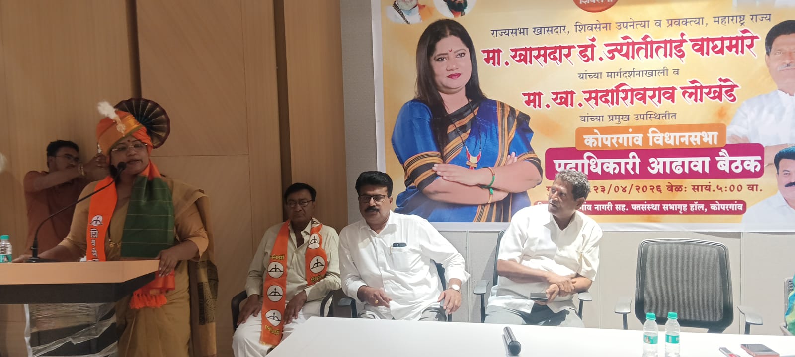 Kopargaon vijay kapse दि २६ एप्रिल २०२६– पक्षाचं काम न करता पदाचा दुरुपयोग करणाऱ्या पदाधिकाऱ्यांचे पद काढून घेण्याचे काम पक्ष करील. पक्षासाठी काम करून जनतेला न्याय देणाऱ्या उमेदवाराला शिवसेनेत काम करण्याची संधी दिली जाईल. ८० टक्के समाजकारण व २० टक्के राजकारण या हिंदुहृदयसम्राट बाळासाहेब ठाकरे यांच्या तत्त्वावर शिवसेना पक्षप्रमुख एकनाथ शिंदे यांच्या मार्गदर्शनाखाली काम करायचं आहे.शेवटच्या घटकापर्यंत न्याय देण्याचे काय एकनाथ शिंदे साहेब यांनी केले आहे. माझ्यासारख्या सर्वसामान्य महिलेला राज्यसभेची खासदारकी बहाल केली. महिला शेतकरी वारकरी व रुग्णांसाठी विविध योजना त्यांनी सुरू केल्या. संत महंतांना संरक्षण ,वारकरी दिंडीला अनुदान, विमा कवच यामुळे त्यांनी महाराष्ट्रातील सर्वसामान्यांचा मुख्यमंत्री म्हणून नाव कोरले.वारकऱ्यामध्ये विठ्ठल शोधणारा मुख्यमंत्री एकनाथ शिंदे यांच्या रूपाने महाराष्ट्राने पाहिला असल्याचे प्रतिपादन राज्यसभा खासदार शिवसेना शिवसेनेचे उपनेत्या खा ज्योतीताई वाघमारे यांनी कोपरगाव येथे पोहेगाव नागरी पतसंस्थेच्या सभागृहात कोपरगाव विधानसभा पदाधिकाऱ्यांच्या आढावा बैठकीत मार्गदर्शन करताना बोलत होत्या.